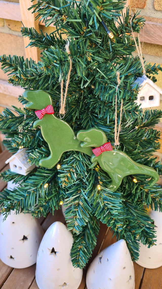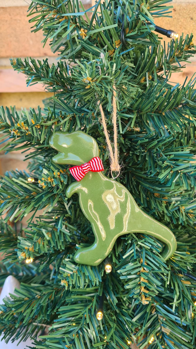 Ceramic hanging Christmas tree ornament - Green glazed dinosaur wearing a red bowtie!